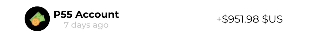 Every effort has been made to accurately represent the P55 Account and its potential. However, there is no guarantee that you will earn any money using the techniques and ideas in this product. Examples shown or referenced should not be interpreted as a promise or guarantee of earnings. Earning potential is entirely dependent on the person using the product, their experience, work ethic, and market conditions. We do not purport this as a "get rich scheme." Your level of success depends on your actions, consistency, and various external factors beyond our control.